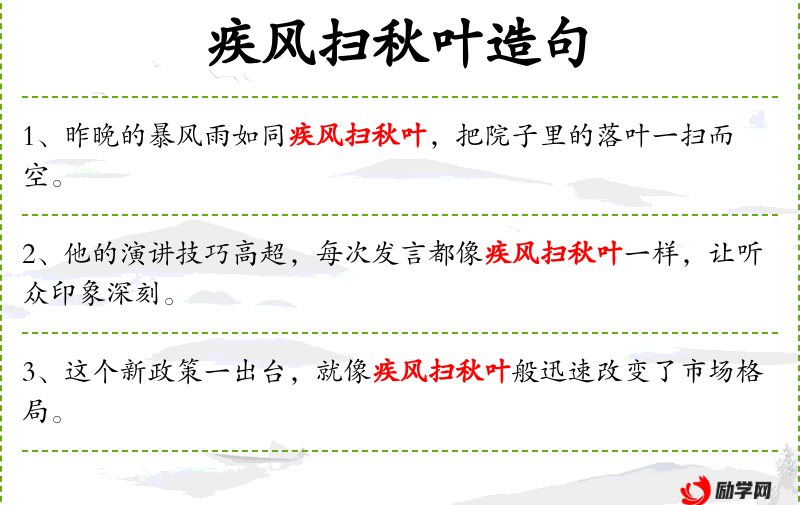 1. 【疾风扫秋叶】 疾:猛烈。比喻力量强大、行动迅速,象暴风扫除落叶一样。