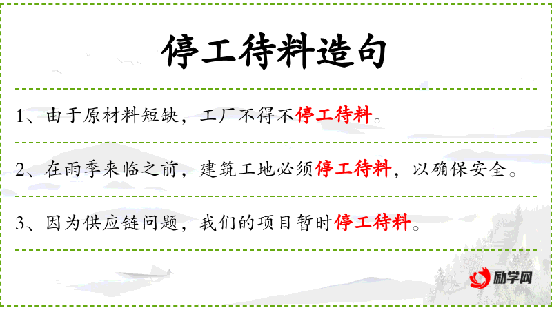- 停工待料:指因材料供应不足而暂停生产。
