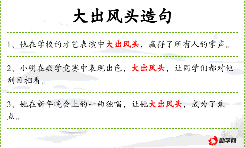 - 使用“大出风头”这样的成语增加了句子的生动性和表现力。