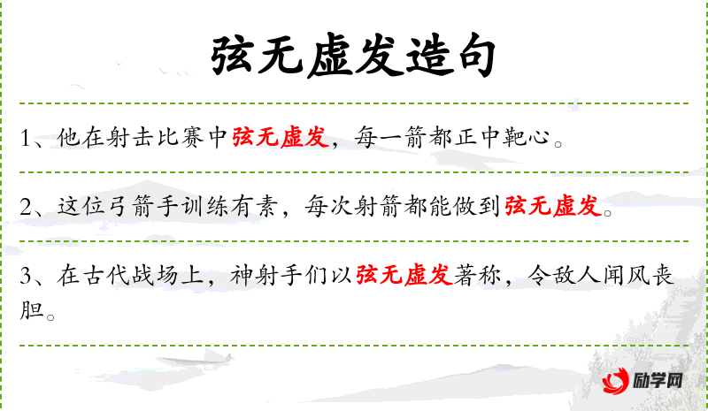 - 弦无虚发:形容射箭技术高超,每一箭都能命中目标。
