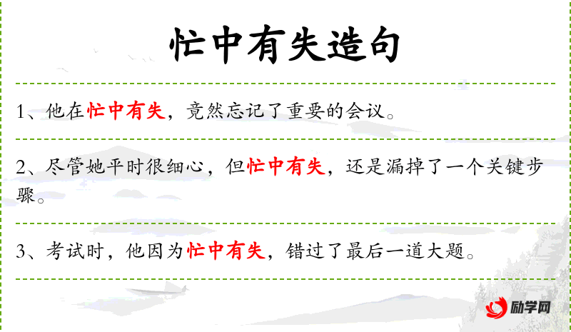 - 忙中有失:成语,意思是忙碌中容易出错。
