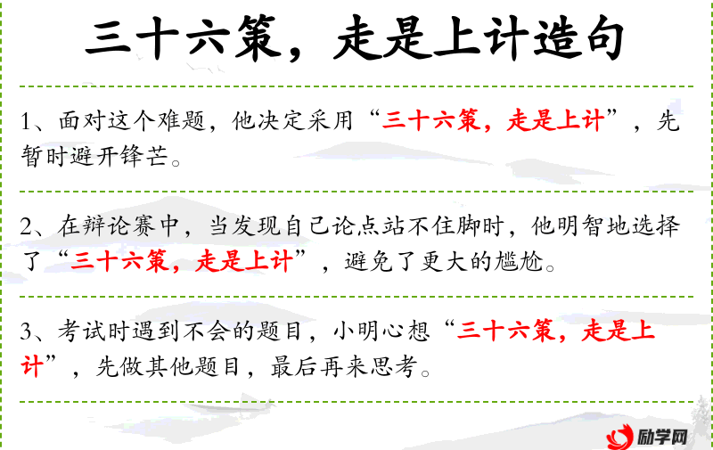 “三十六策,走是上计”是一个**成语,源自古代兵法,意味着在面对困难或危险时,最好的策略是暂时撤退或避开。这个成语体现了中华文化中对于策略和智慧的重视。