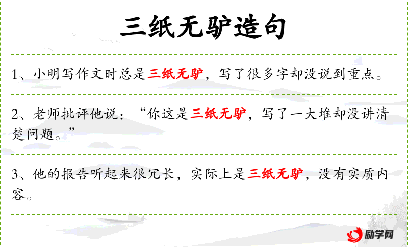 - 三纸无驴:成语,源自“三纸无驴”,形容文章或言辞冗长而空洞,没有实质内容。