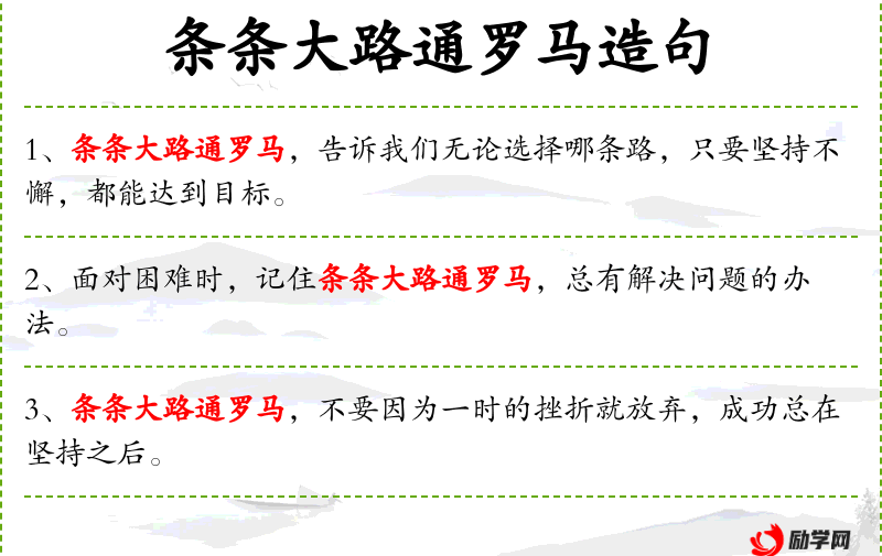 1. 【条条大路通罗马】 - 比喻采用许多不同的方法办事,都可以收到同样的效果。