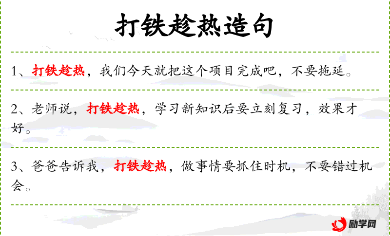 - 打铁趁热:成语,比喻做事要抓紧时机,不可拖延。