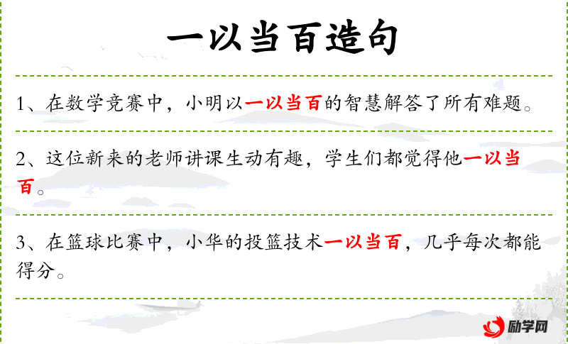 1. 【一以当百】 - 一人抵过百人。极言勇猛。