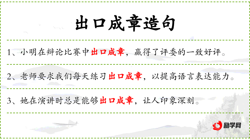 - 出口成章:形容说话或写作流畅,有条理。