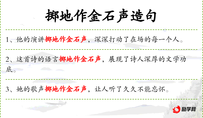 “掷地作金石声”这个成语源自古代,形容言辞或建议非常有力、坚定。这个成语体现了文化中对言辞力量的重视。