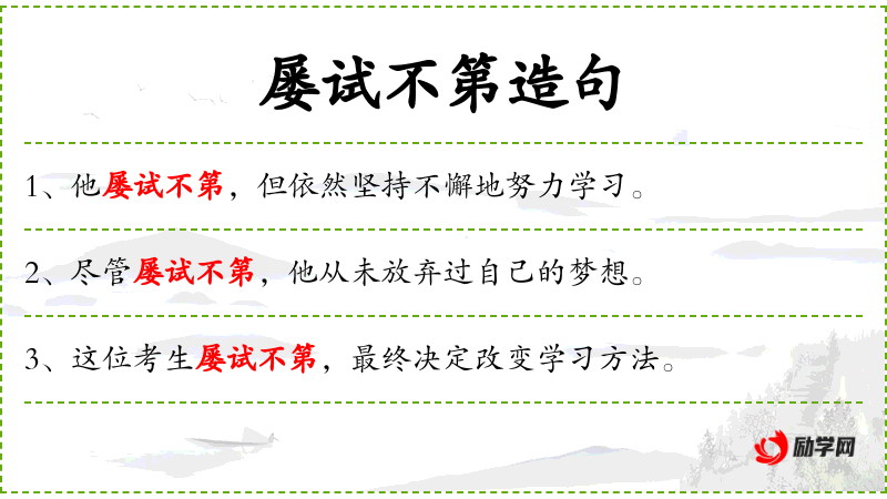 - 状语:屡试不第、最终、在老师的帮助下