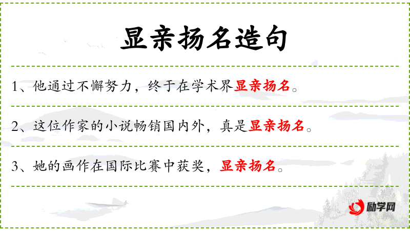 3. 【显亲扬名】 - 显:显赫;亲:父母;扬:传扬。指使双亲显耀,名声传扬。