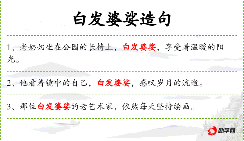 4. 【白发婆娑】 - 婆娑:纷披的样子。形容满头白发的老年人的样子。
