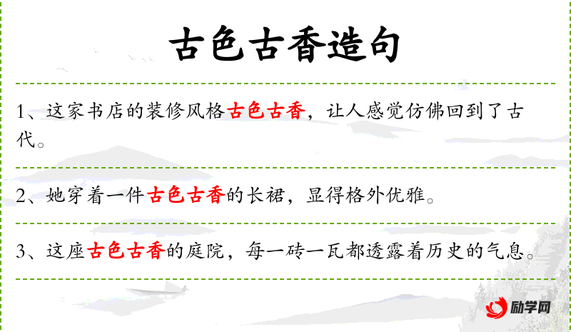 1. 【古色古香】 形容器物书画等富有古雅的色彩和情调。