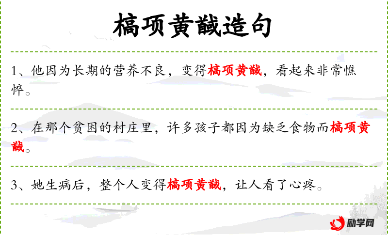 3. 【槁项黄馘】 - 槁:枯干;项:颈项;馘:脸。颈项枯瘦,面色苍黄。形容不健康的容貌。