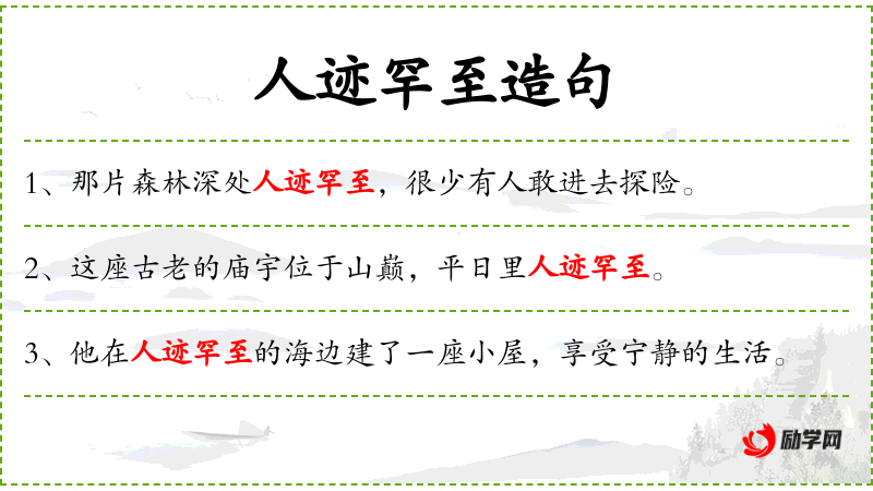 - 人迹罕至:荒凉、偏僻、幽静