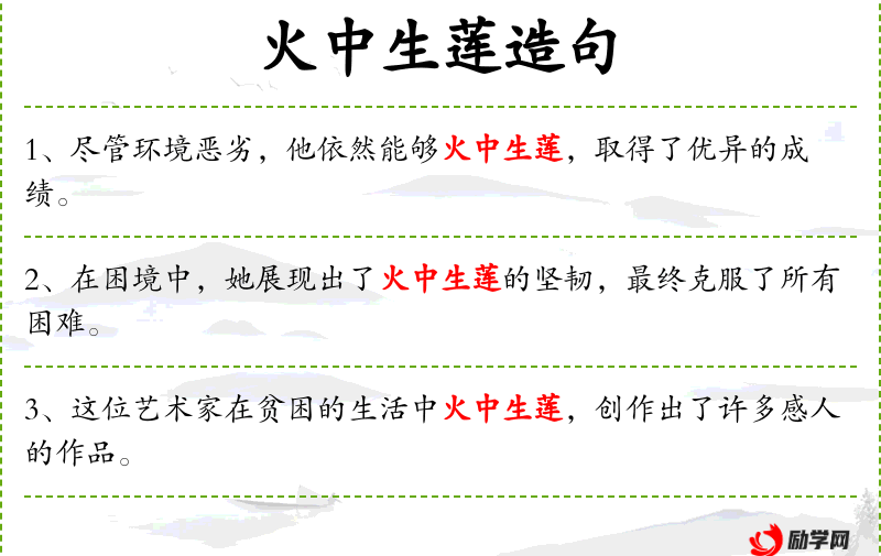 5. 【火中生莲】 - 火里生长出来的莲花。比喻稀有或难得。后指深陷火炕,遭到不幸,但能洁己不毁。