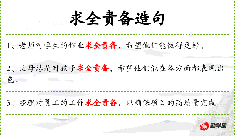 5. 【求全责备】 - 求、责:要求;全、备:完备,完美。对人对事物要求十全十美,毫无缺点。
