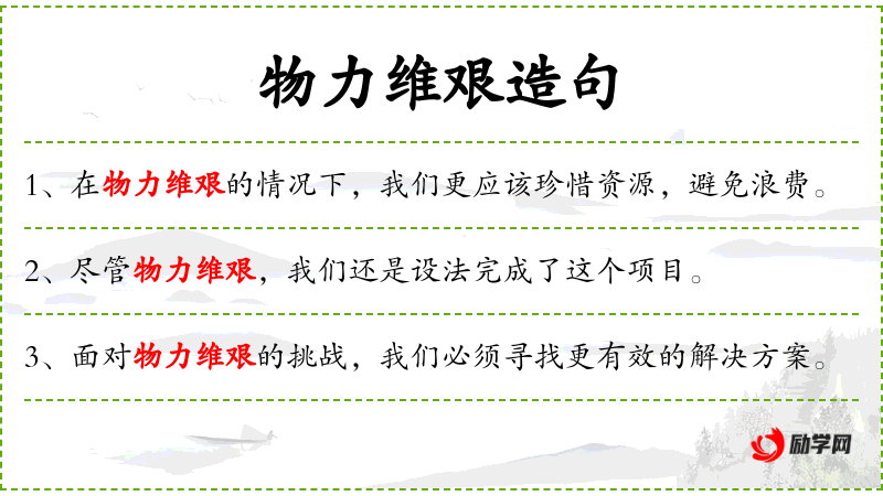2. 【物力维艰】 - 物:物资;力:财力;维:是;艰:困难。指财物来之不易。