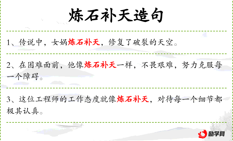 1. 【炼石补天】 炼:用加热的方法使物质纯净或坚韧。古神话,相传天缺西北,女娲炼五色石补之。比喻施展才能和手段,弥补国家以及政治上的失误。