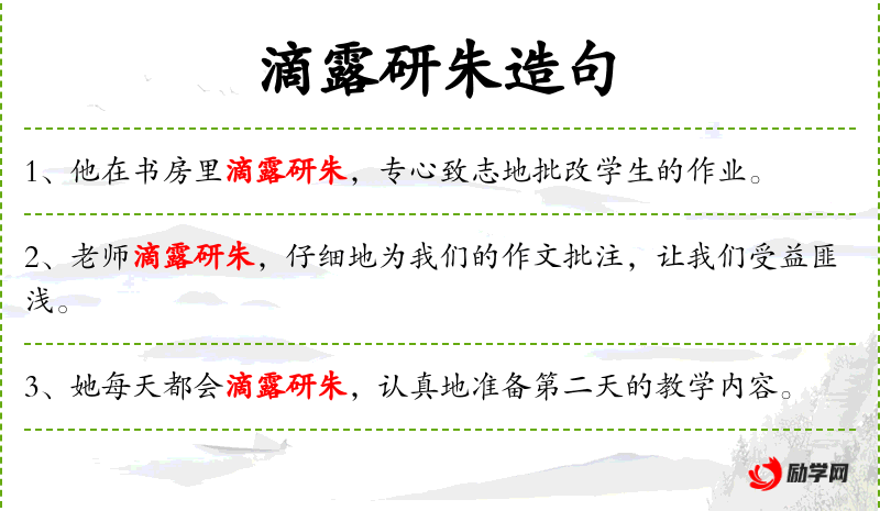 3. 【滴露研朱】 - 滴水研磨朱砂。指用朱笔评校书籍。