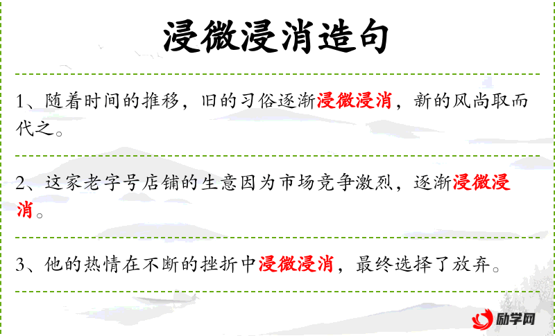 5. 【浸微浸消】 浸:渐渐;微:衰败;消:消失。逐渐衰微而至于消失。