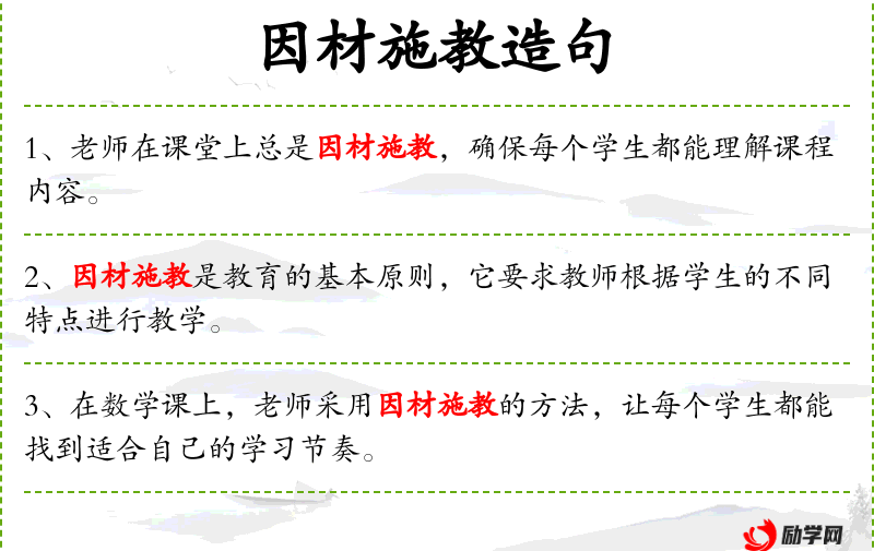 1. 【因材施教】 因:根据;材:资质;施:施加;教:教育。指针对学习的人的志趣、能力等具体情况进行不同的教育。