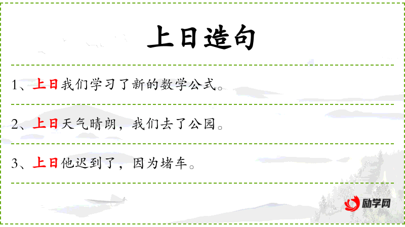 朔日,即农历初一。《书.舜典》"正月上日,受终于文祖。"孔传"上日,朔日也。"《初学记》卷四引隋杜台卿《玉烛宝典》"正月为端月,其一日为元日,亦曰上日。"清金农《元日过张少府小饮花下》诗"仙尉逢梅福,同为上日吟。"一说上日指阴历每月上旬之吉日; 佳日,佳节。
