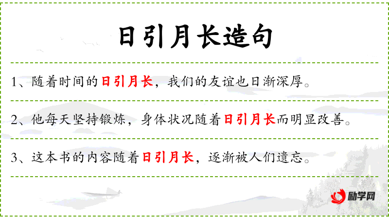 1. 【日引月长】 引:延伸,这里有增加的意思。指事物随着时光的流逝而日渐增长。