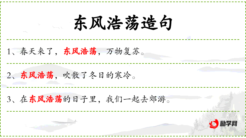 - 主语:在第一个分句“东风浩荡”中,“东风”是主语,指春天的风。在第二个分句“孩子们在草地上欢快地奔跑”中,“孩子们”是主语。