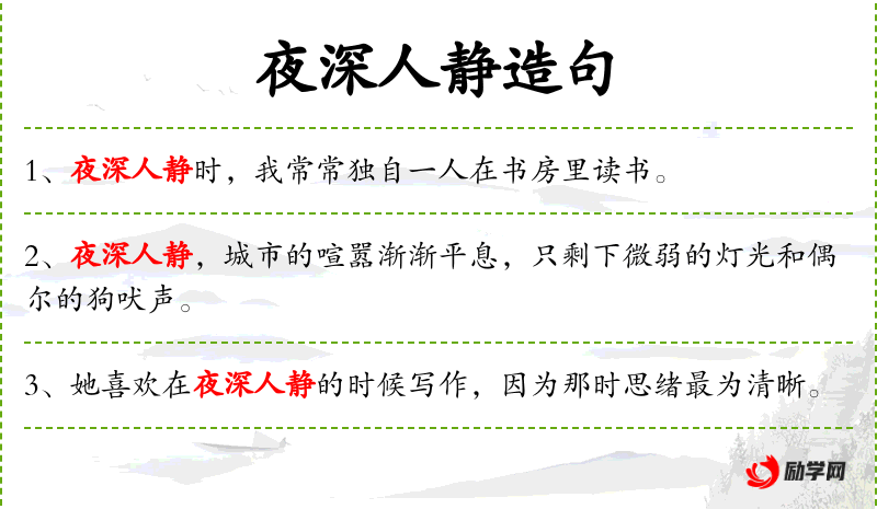 - 夜深人静:形容夜晚非常安静,常用来描述深夜的宁静。