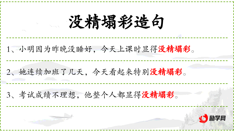 4. 【没精塌彩】 - 形容精神不振,情绪低落。同“没精打彩”。