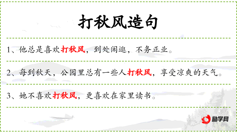 - 打秋风:成语,字面意思是追逐秋天的风,实际指在秋天到户外活动,享受秋天的美好。