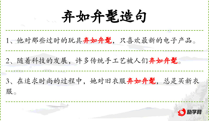 - 成语:“弃如敝屣”源自《左传·僖公二十三年》,是**传统文化中的一个常用成语,体现了对物品价值的轻视。