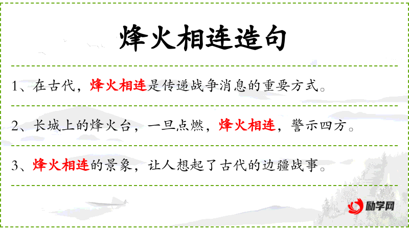 1. 【烽火相连】 - 烽火:古代边防报警的烟火。指边防常抓不懈,比喻战火不断。