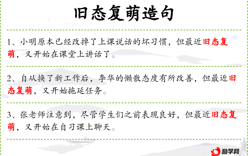 句子中的“旧态复萌”是一个成语,源自传统文化,用来形容恢复到以前的不良状态。这反映了人对于*惯和行为的一致性的重视。
