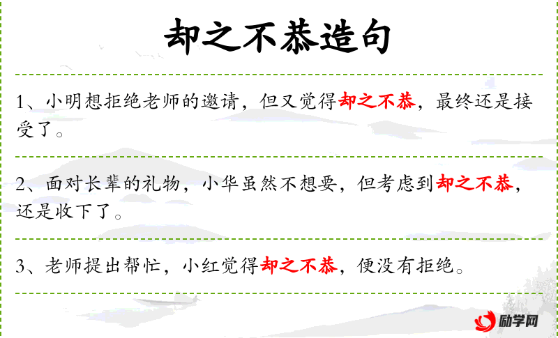 - 却之不恭:成语,意思是拒绝别人的好意是不礼貌的。