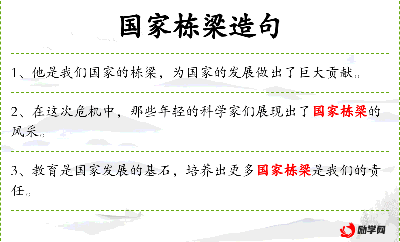 - 国家栋梁:比喻为国家做出重要贡献的人才。