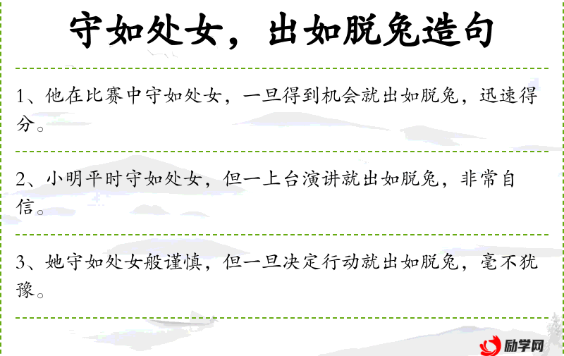 - “守如处女,出如脱兔”是**传统文化中的成语,用来形容人在不同情境下的行为特点。