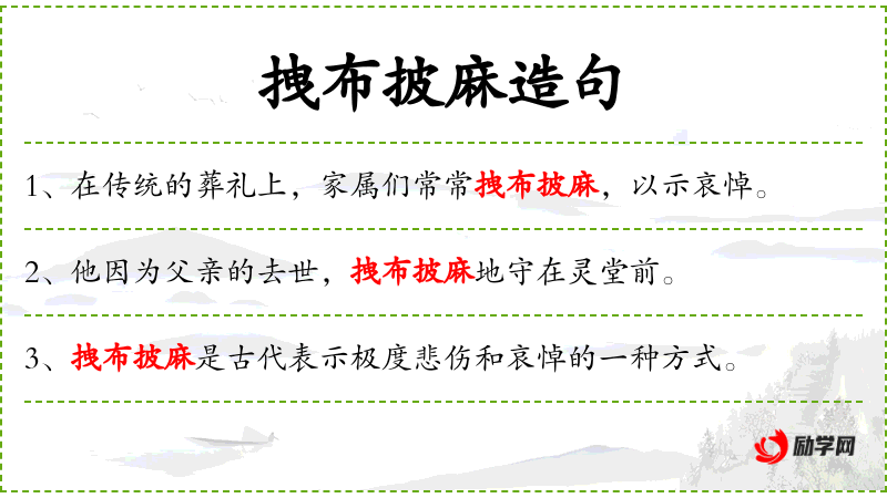 句子:“他因为父亲的去世,拽布披麻地守在灵堂前。”