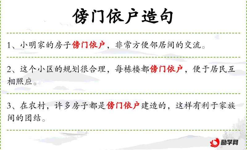 - 房子都是傍门依户的:形容房子布局紧凑,邻里关系紧密。