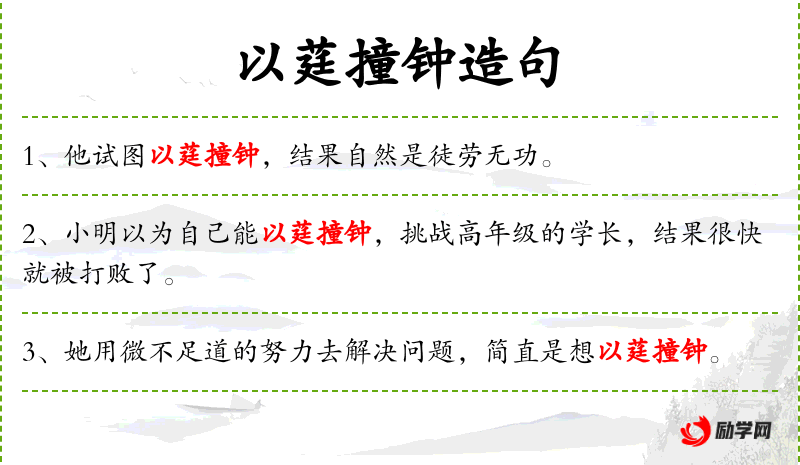 - 以莛撞钟:这个成语源自古代,形象地描述了力量小而试图做大事的无效行为。在文化中,这种表达强调了实际与表面之间的差异。