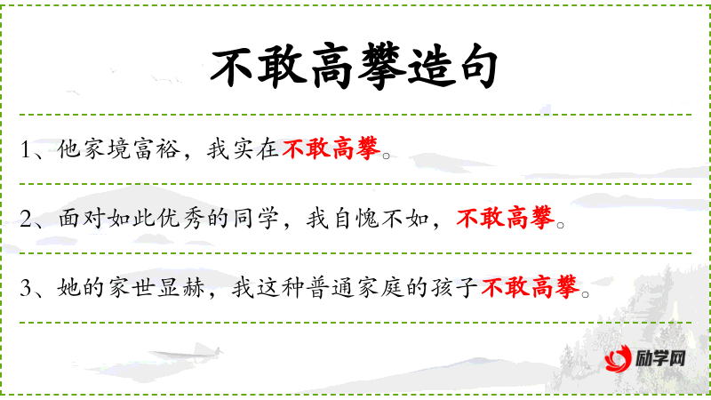 1. 【不敢高攀】 不敢跟社会地位比自己高的人交朋友或结亲戚。
