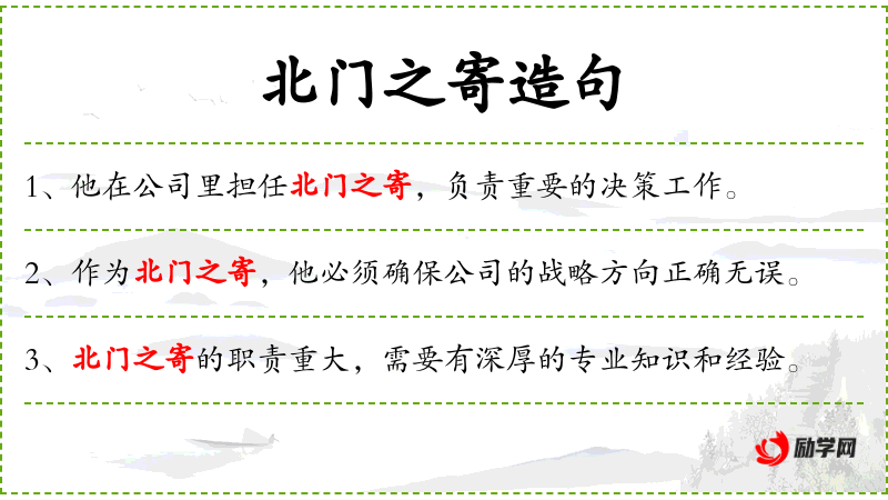 在实际交流中,这样的句子可能用于赞扬某人的专业能力或领导才能。使用“北门之寄”这样的称号增加了句子的正式性和尊重感。
