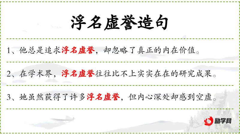 1. 【浮名虚誉】 浮名:虚有的名声;虚誉:不实在的称誉。虚有的名声和不实在的称誉。
