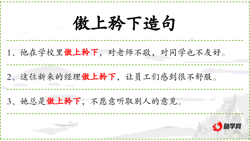 - 傲上矜下:这个词组描述的是一种态度,即对上级傲慢,对下级自负。