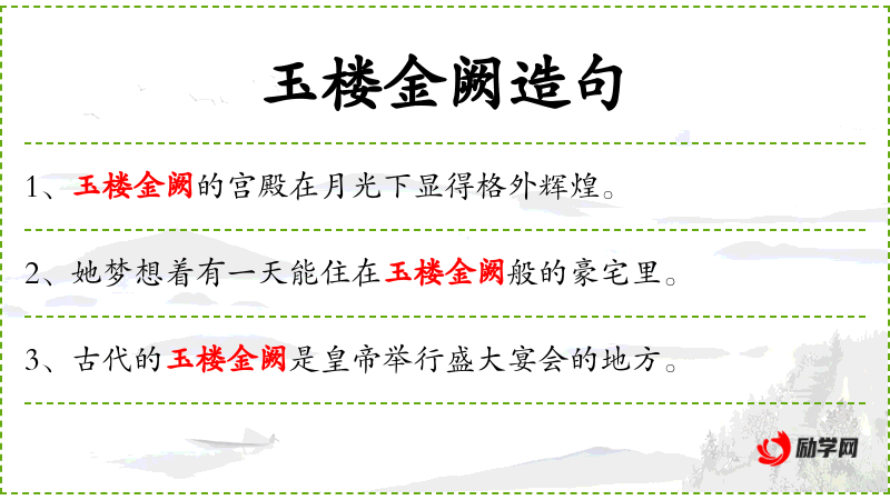 1. 【玉楼金阙】 美玉砌成的楼房,金子搭成的宫殿。形容楼阁宫室的精致优美或指仙人之居处。