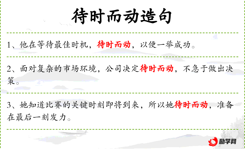 2. 【待时而动】 时:时机。等待时机然后行动。