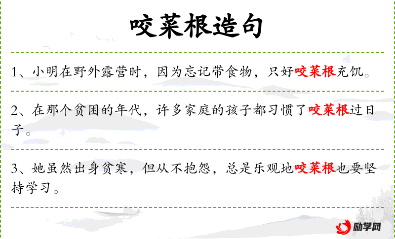 - 爷爷总是回忆起他们年轻时咬菜根的日子,那些艰难的岁月磨练了他们的意志。
