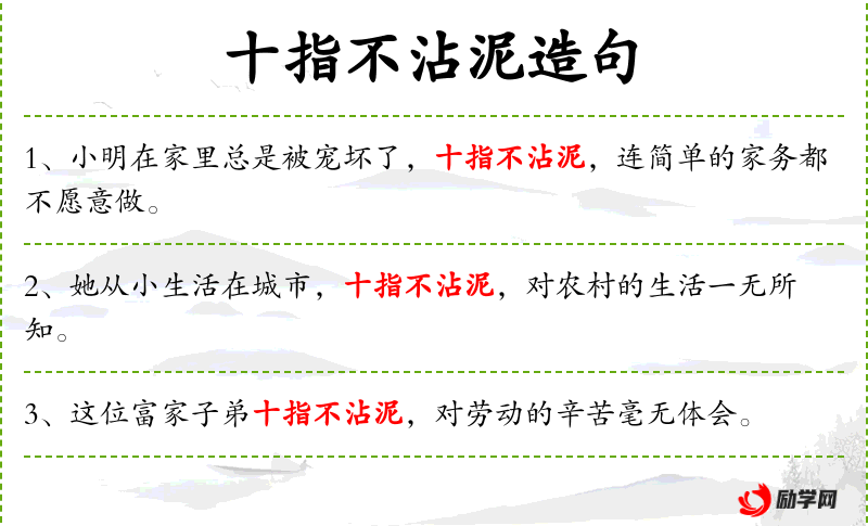 - 谓语:十指不沾泥,对劳动的辛苦毫无体会