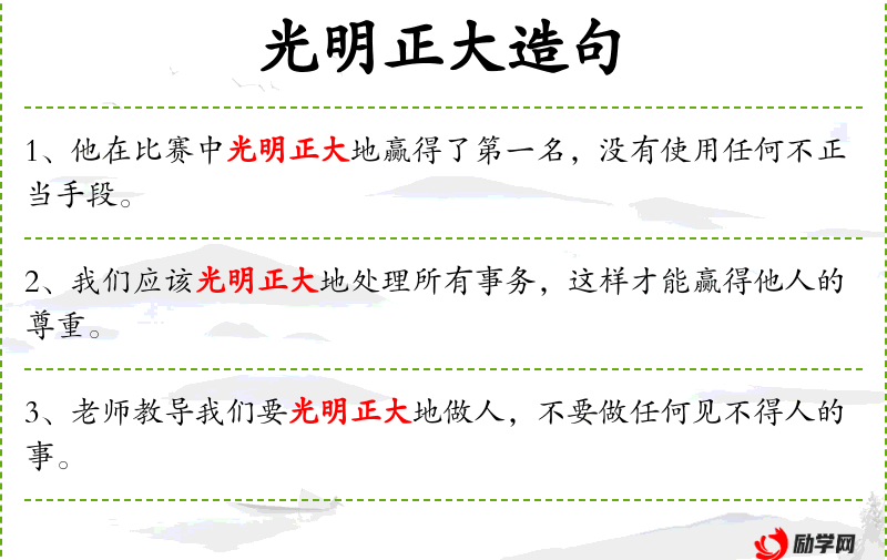 - 光明正大:形容做事公开,不隐瞒,不欺骗。