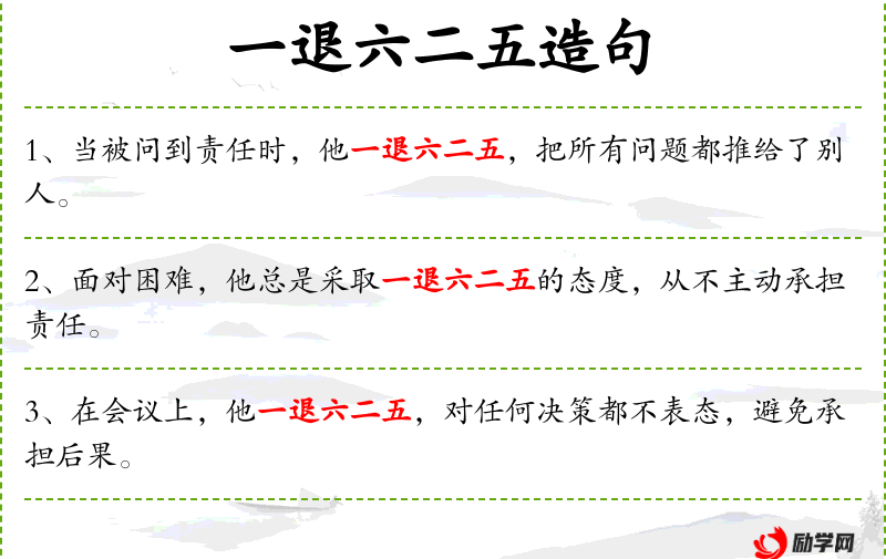 - 一退六二五:这是一个成语,意思是推卸责任,把责任推给别人。
